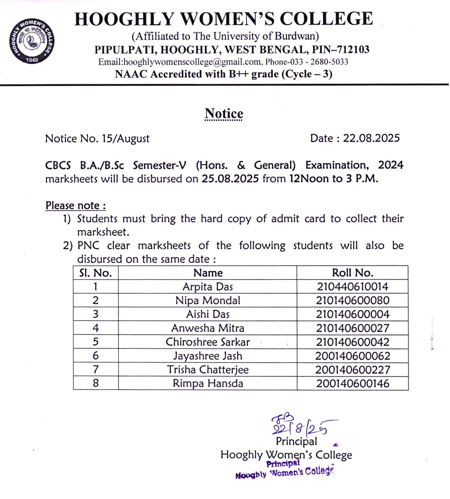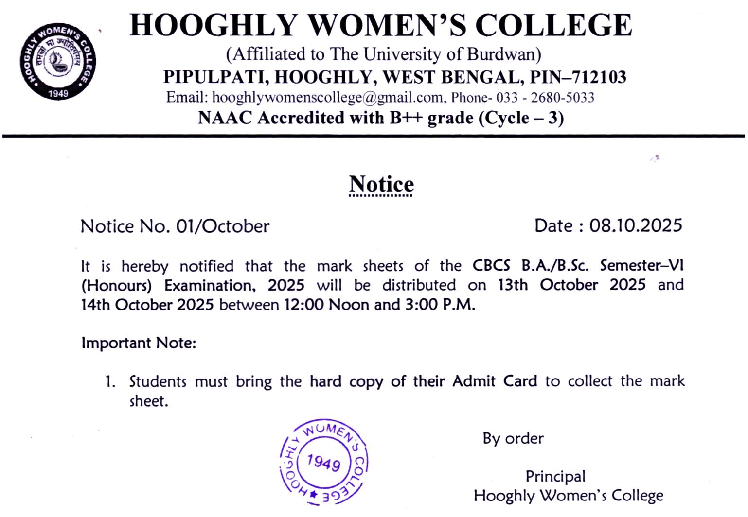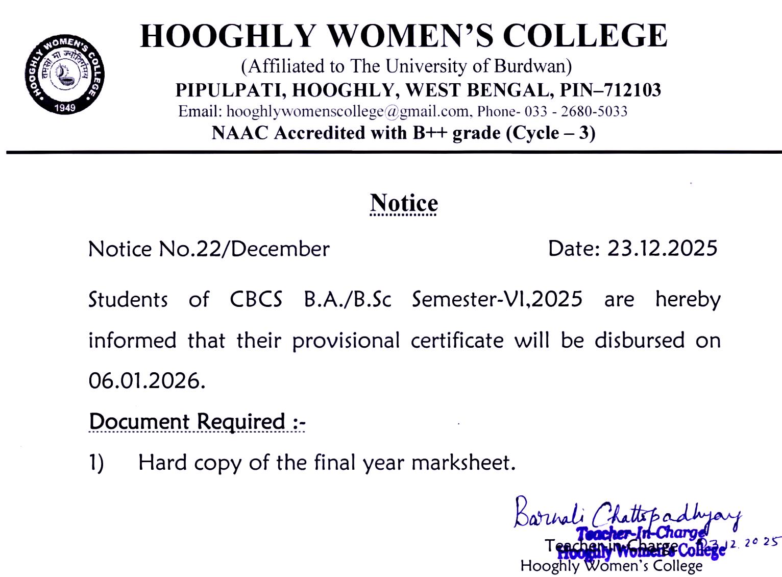 ----- Notification regarding distribution of CBCS B.A./B.Sc Semester VI,2025 Examination marksheet |