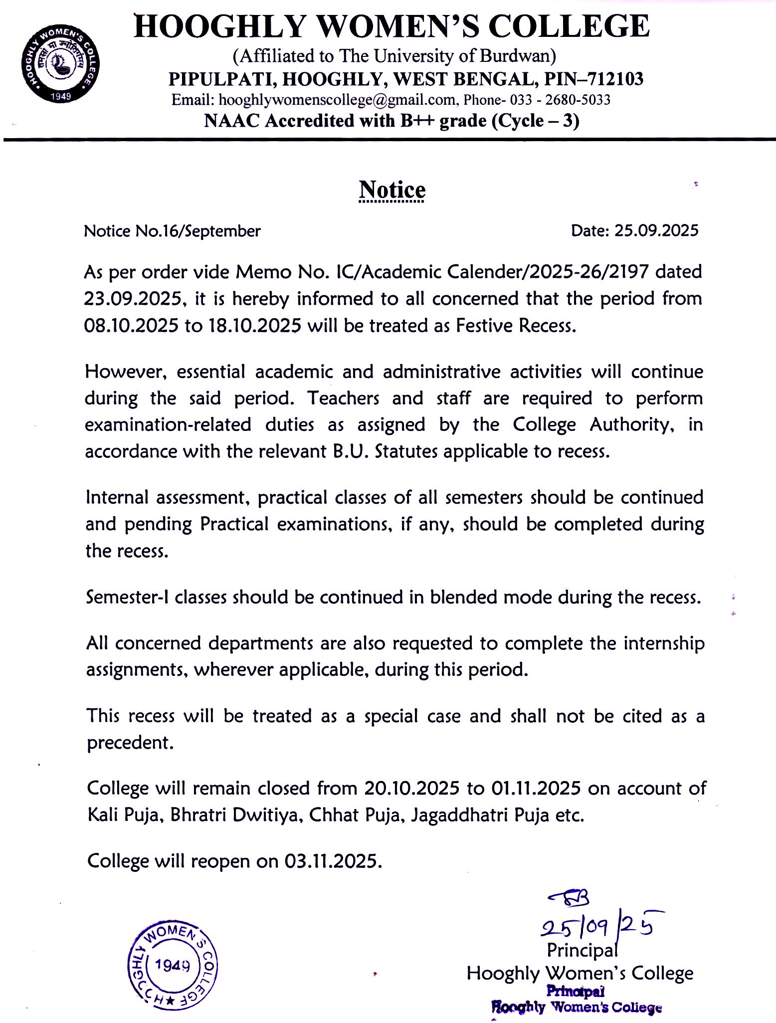 ----- Notification regarding Festive Recess and subsequent Puja Holidays |