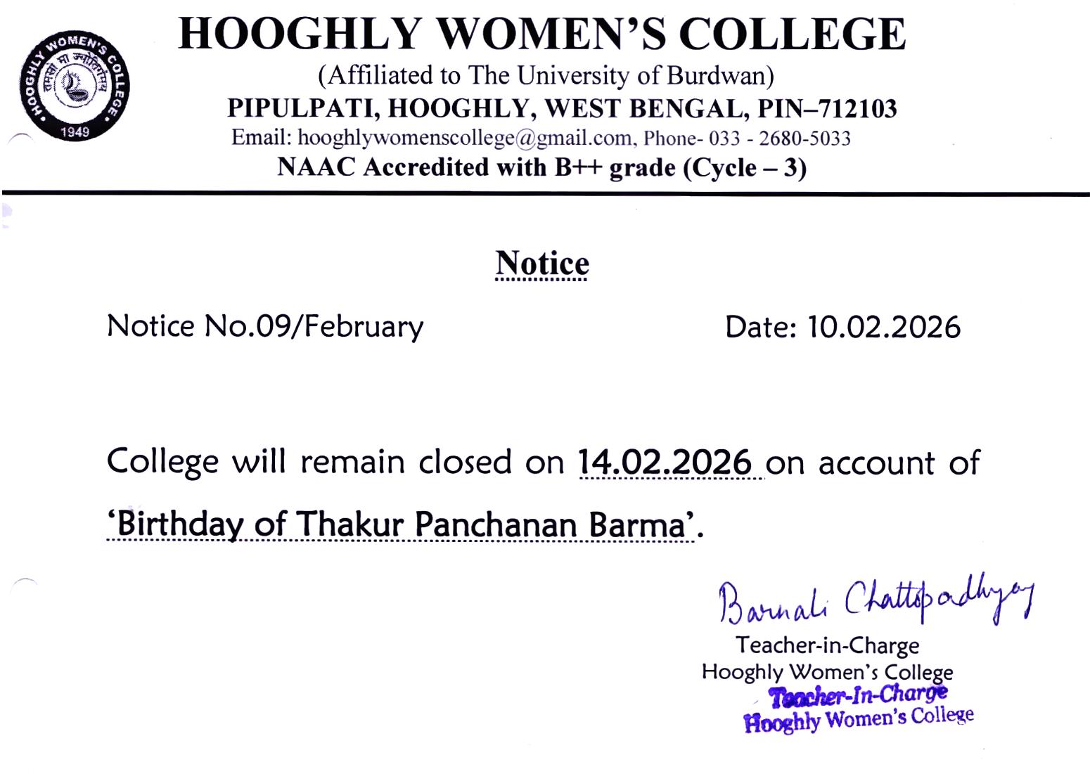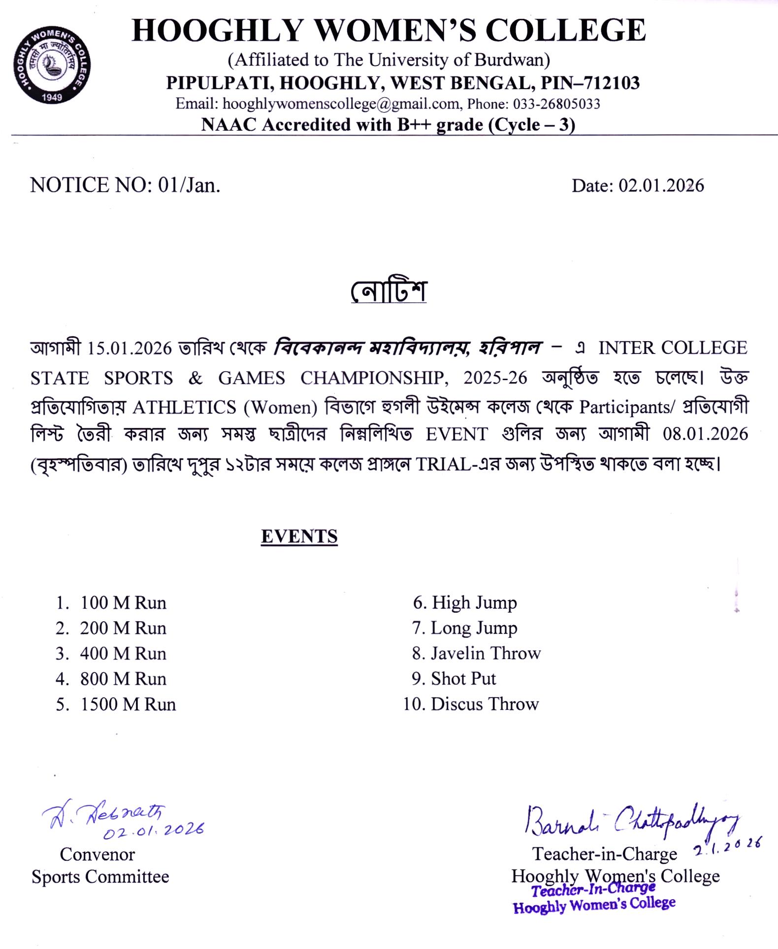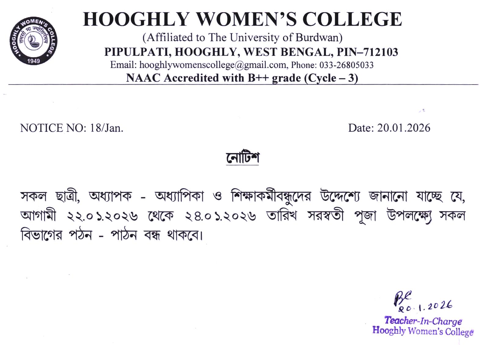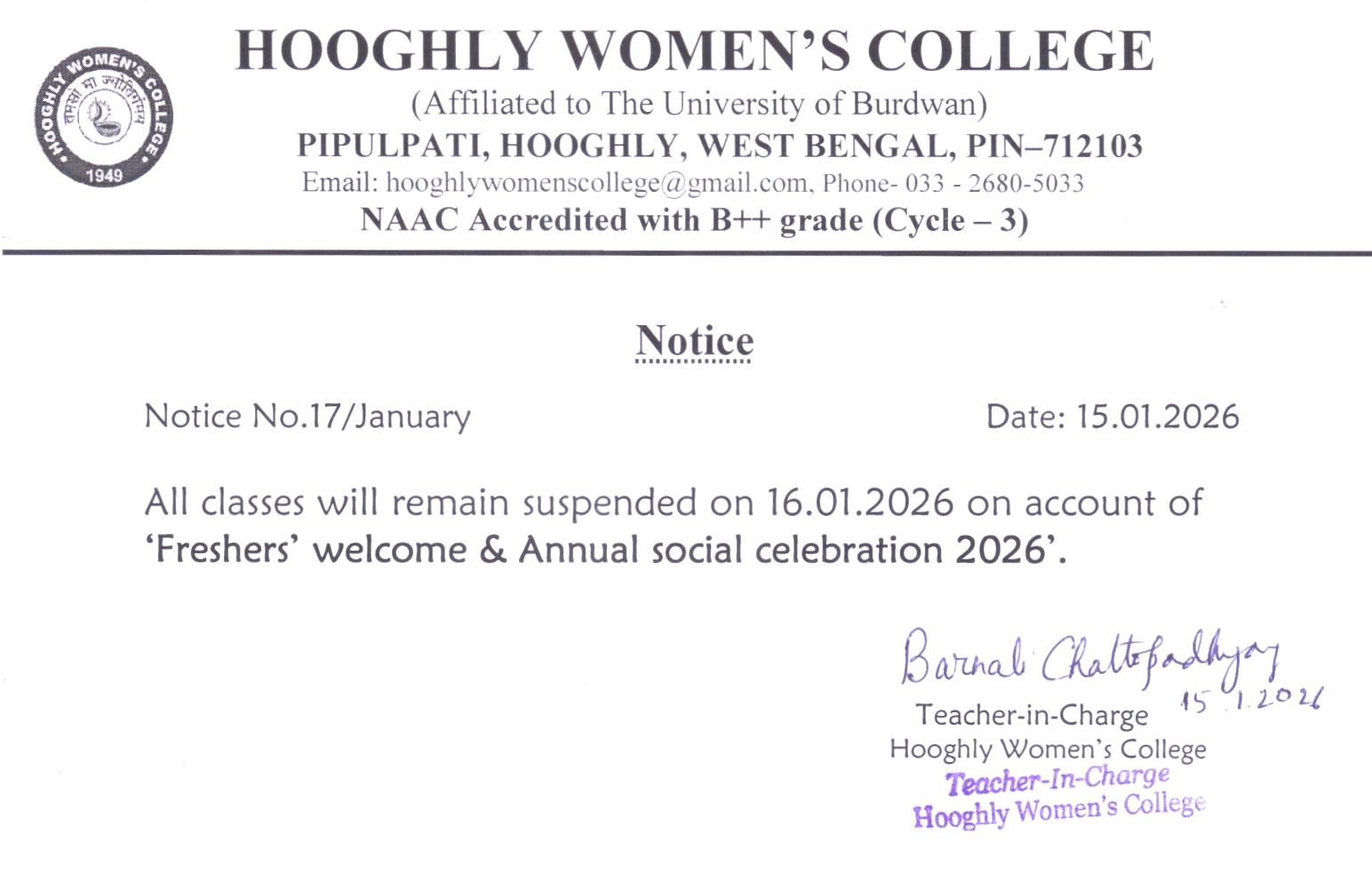 ----- Notification regarding classes of B.A./B.Sc Semester II 2026 |
