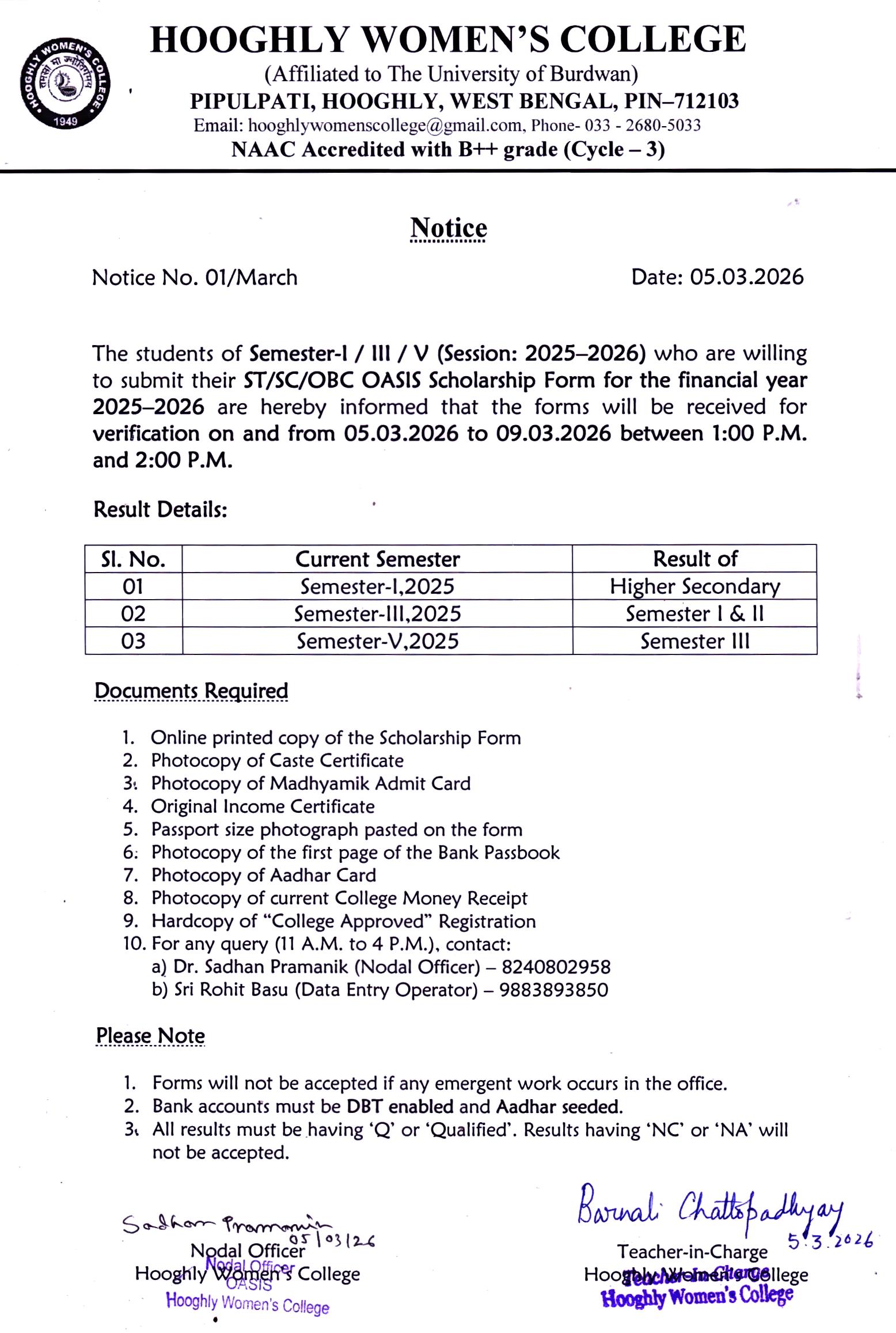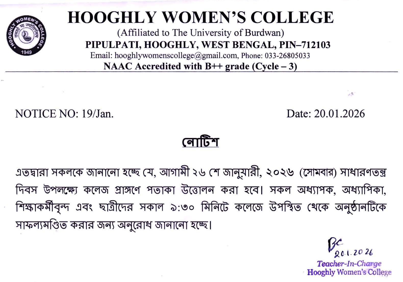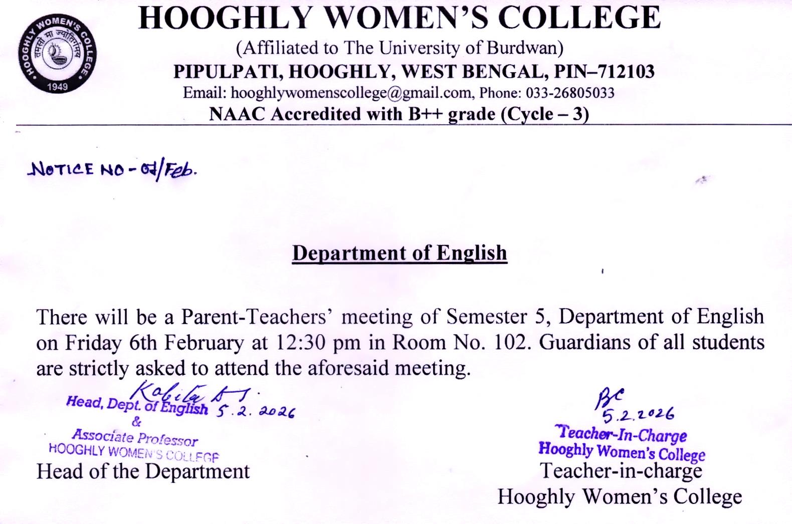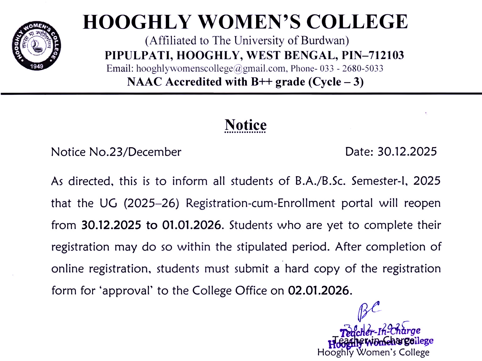 ----- Notification regarding classes of B.A./B.Sc Semester II 2026 |
