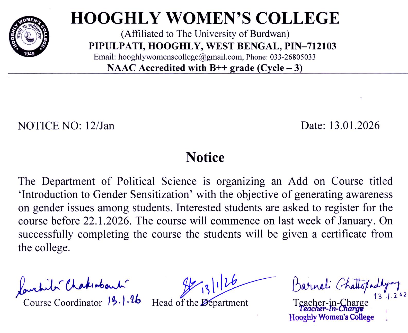 ----- Notiification regarding add-on course organized by The Dept. of Political Science |