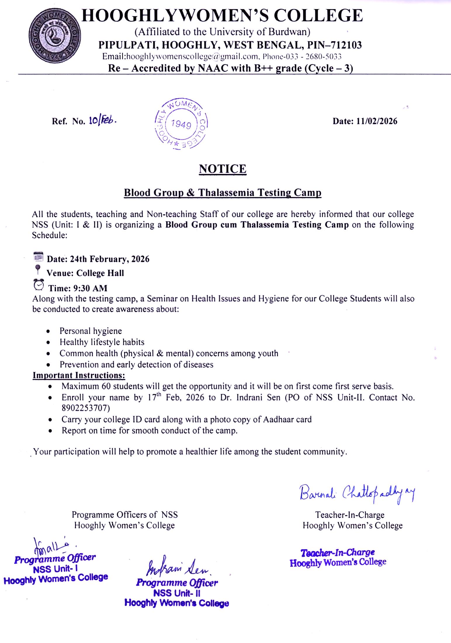 ----- Notification regarding Blood Group and Thalassemia Test Camp |